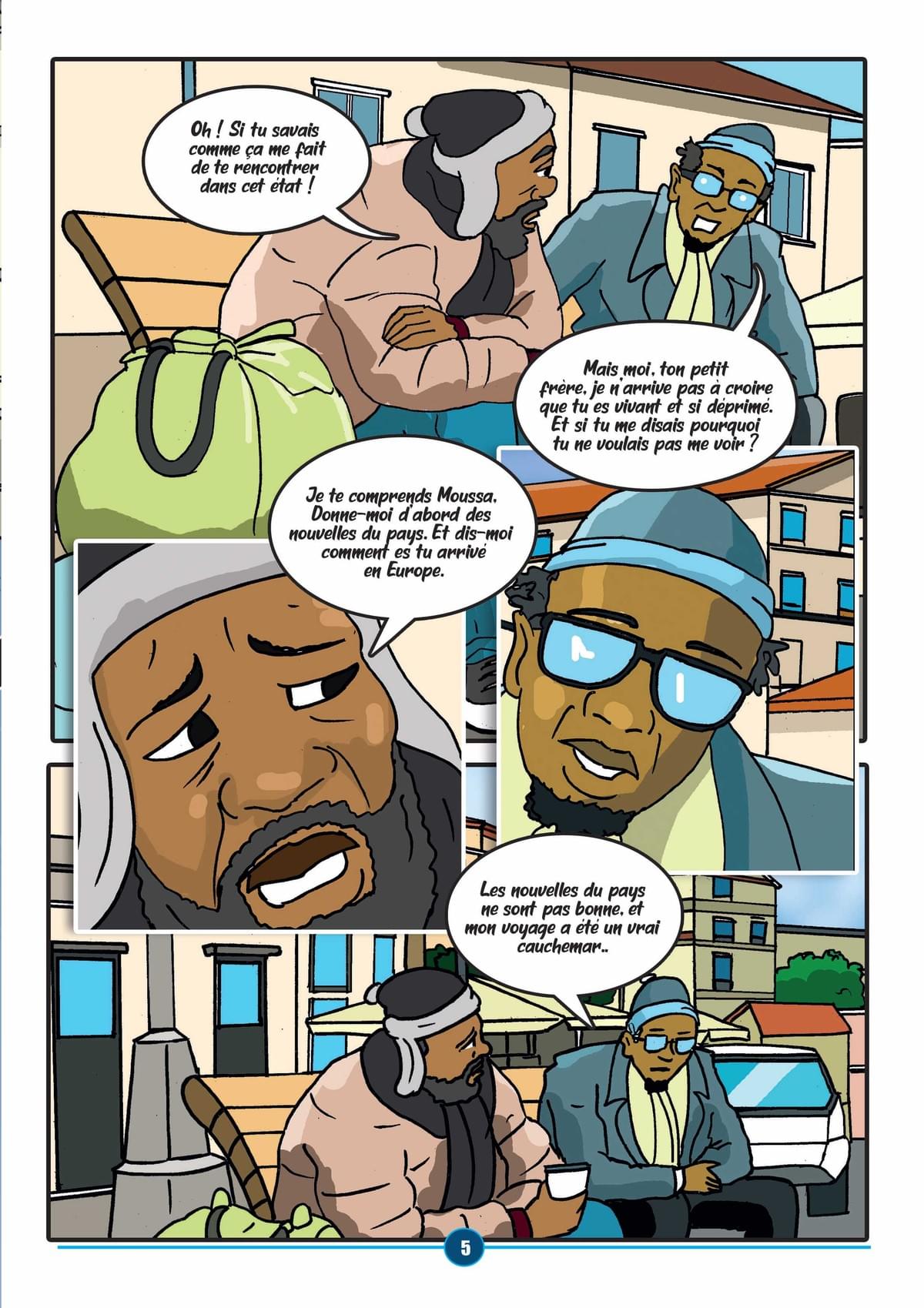 Cette bande dessinée est l’histoire de deux frères sénégalais qui se sont retrouvés en Europe après avoir resté 10 ans sans se revoir. Abdou, le grand frère, était parti en Europe clandestinement en passant par le désert pour faire l’aventure dans le but d’aider ses pauvres parents restés au pays. Mais il fut très déçu par les dures réalités de l’Europe, il fut emprisonné pour une peine de dix ans. Moussa, son jeune frère, va partir lui aussi clandestinement en passant par la mer après la mort de son père, mais à sa grande surprise, il retrouvera son frère Abdou. C’est ainsi que va commencer notre histoire….